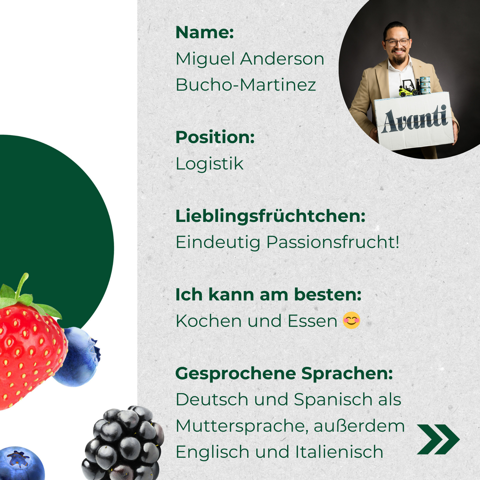 Gemeinsam mit Iris Wittur und Isabella di Pinto kümmert sich Miguel darum, dass unsere Ware zuverlässig von A nach B kommt. Für unsere vergangenen Food News haben wir ihn bereits interviewt und heute stellen wir ihn als Früchtchen des Monats vor.